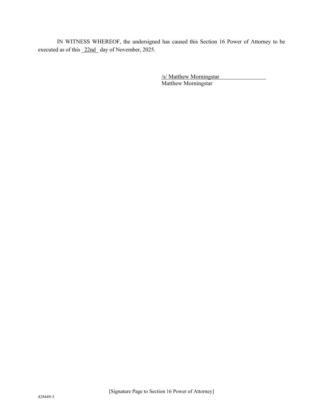 [Signature Page to Section 16 Power of Attorney] 428449-3 IN WITNESS WHEREOF, the undersigned has caused this Section 16 Power of Attorney to be executed as of this _22nd_ day of November, 2025. /s/ Matthew Morningstar Matthew Morningstar