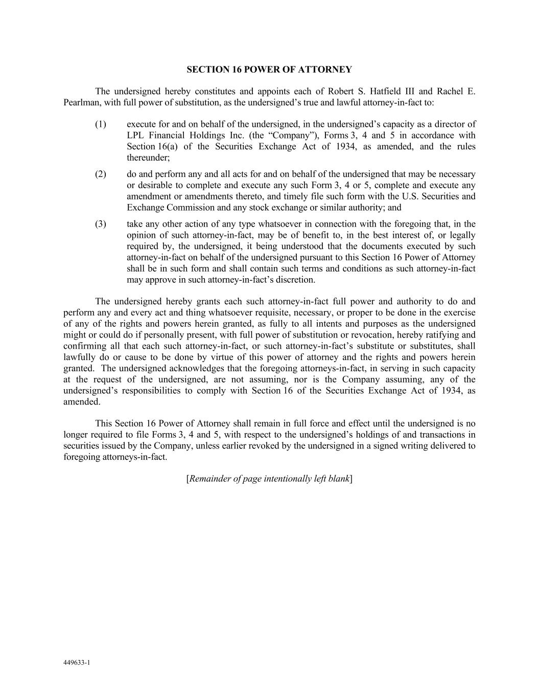 449633-1 SECTION 16 POWER OF ATTORNEY The undersigned hereby constitutes and appoints each of Robert S. Hatfield III and Rachel E. Pearlman, with full power of substitution, as the undersigned’s true and lawful attorney-in-fact to: (1) execute for and on behalf of the undersigned, in the undersigned’s capacity as a director of LPL Financial Holdings Inc. (the “Company”), Forms 3, 4 and 5 in accordance with Section 16(a) of the Securities Exchange Act of 1934, as amended, and the rules thereunder; (2) do and perform any and all acts for and on behalf of the undersigned that may be necessary or desirable to complete and execute any such Form 3, 4 or 5, complete and execute any amendment or amendments thereto, and timely file such form with the U.S. Securities and Exchange Commission and any stock exchange or similar authority; and (3) take any other action of any type whatsoever in connection with the foregoing that, in the opinion of such attorney-in-fact, may be of benefit to, in the best interest of, or legally required by, the undersigned, it being understood that the documents executed by such attorney-in-fact on behalf of the undersigned pursuant to this Section 16 Power of Attorney shall be in such form and shall contain such terms and conditions as such attorney-in-fact may approve in such attorney-in-fact’s discretion. The undersigned hereby grants each such attorney-in-fact full power and authority to do and perform any and every act and thing whatsoever requisite, necessary, or proper to be done in the exercise of any of the rights and powers herein granted, as fully to all intents and purposes as the undersigned might or could do if personally present, with full power of substitution or revocation, hereby ratifying and confirming all that each such attorney-in-fact, or such attorney-in-fact’s substitute or substitutes, shall lawfully do or cause to be done by virtue of this power of attorney and the rights and powers herein granted. The undersigned acknowledges that the foregoing attorneys-in-fact, in serving in such capacity at the request of the undersigned, are not assuming, nor is the Company assuming, any of the undersigned’s responsibilities to comply with Section 16 of the Securities Exchange Act of 1934, as amended. This Section 16 Power of Attorney shall remain in full force and effect until the undersigned is no longer required to file Forms 3, 4 and 5, with respect to the undersigned’s holdings of and transactions in securities issued by the Company, unless earlier revoked by the undersigned in a signed writing delivered to foregoing attorneys-in-fact. [Remainder of page intentionally left blank]