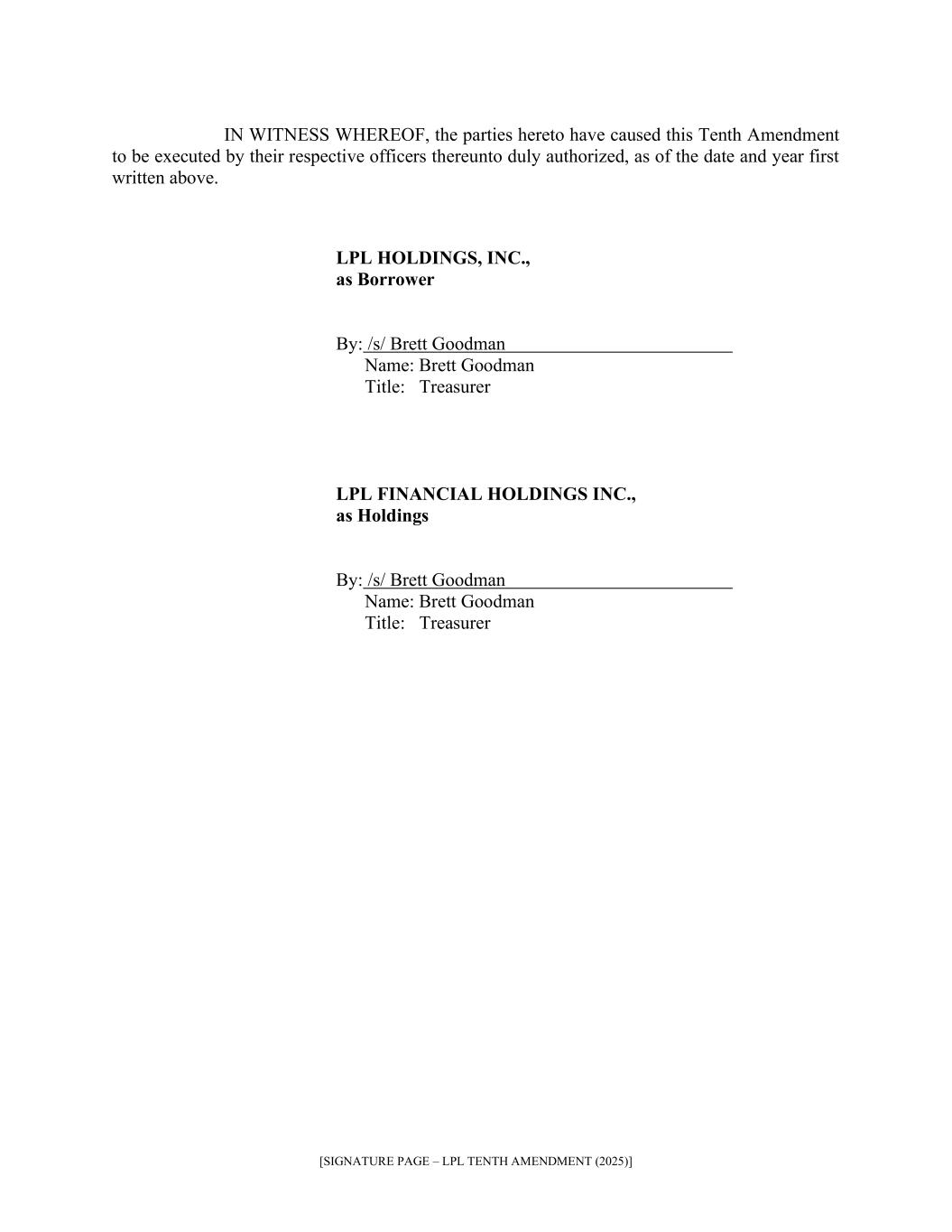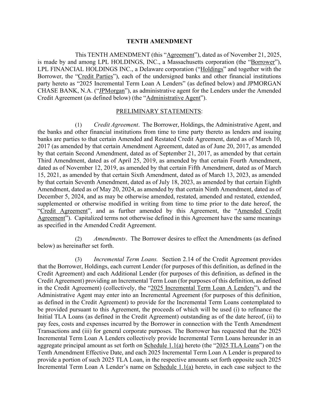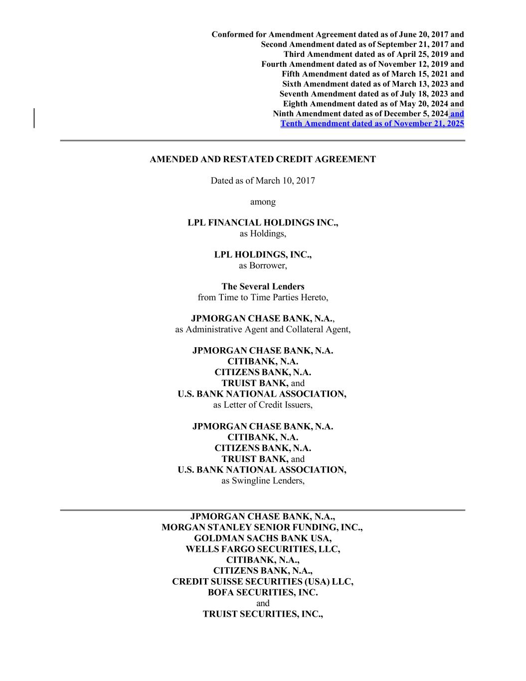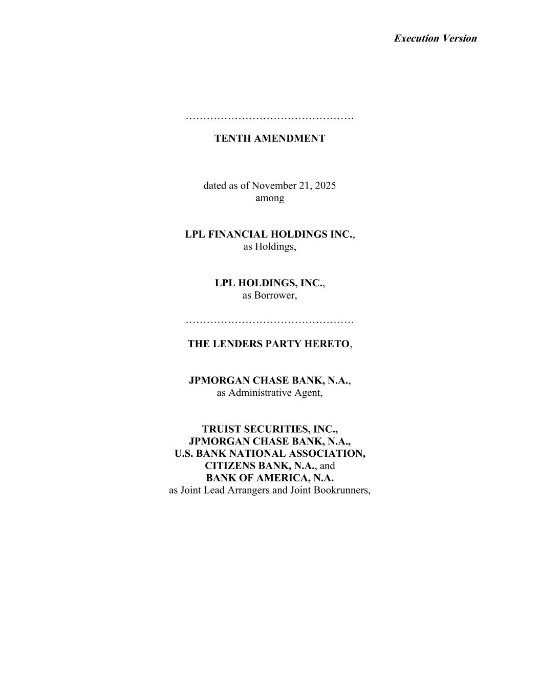 10.30 | Tenth Amendment, dated November 21, 2025, among LPL Financial Holdings Inc., LPL Holdings, Inc., the Incremental Revolving Lenders (as defined therein), JPMorgan Chase Bank, N.A., as administrative agent and collateral agent, letter of credit issuer and swingline lender, and the lenders and parties party thereto from time to time.* | | | | |